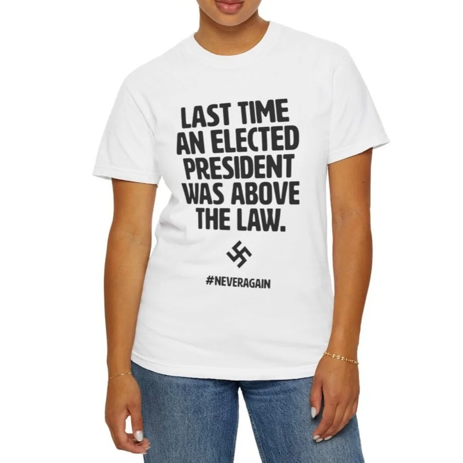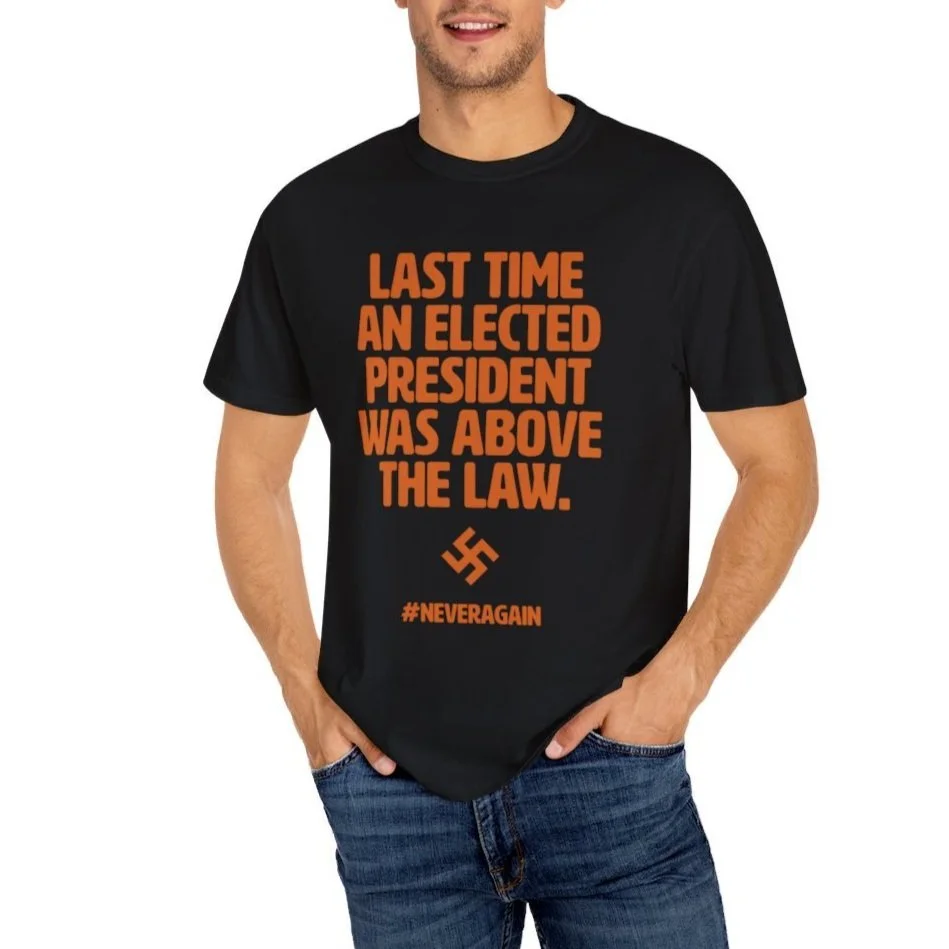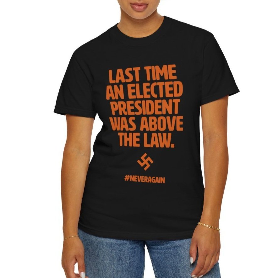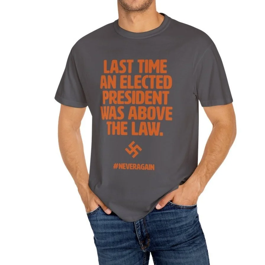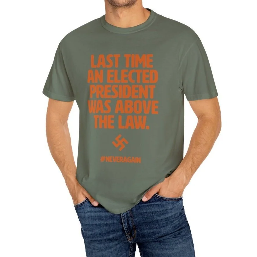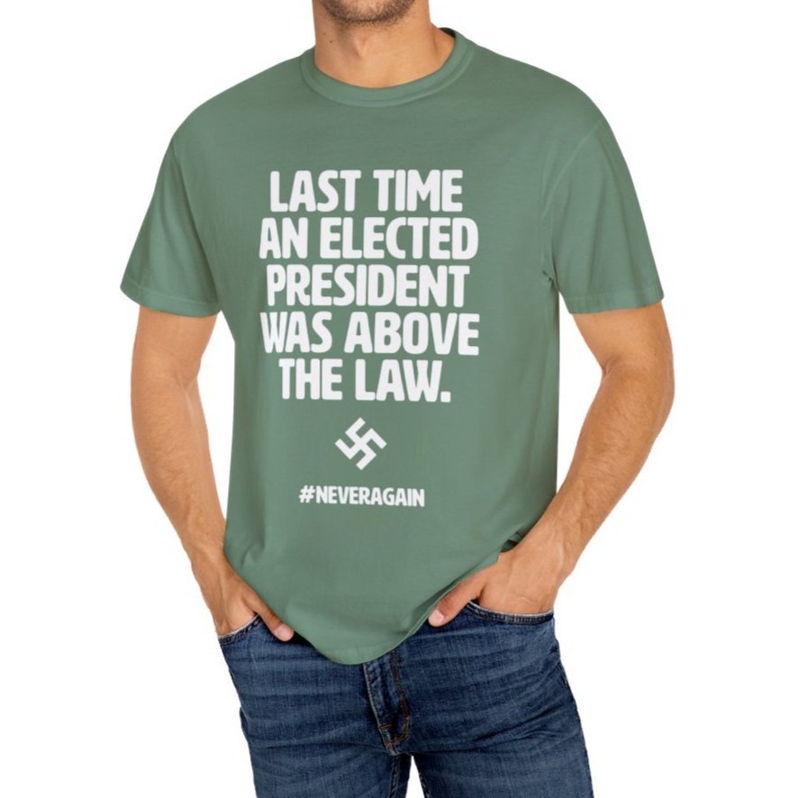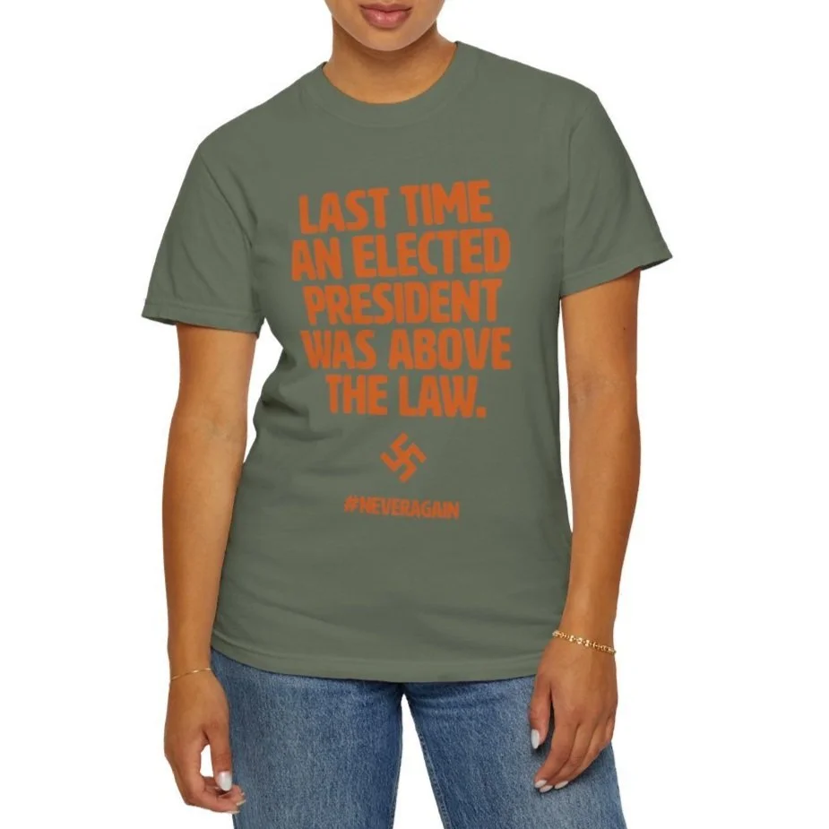 Looking at a swastika is scary. We should be scared. Power and Immunity are a terrifying combination Remind those around you of the history we are reliving with an American-made garment-dyed t-shirt. The double-needle stitching throughout the tee makes it highly durable while the lack of side-seams helps the shirt retain its tubular shape.
